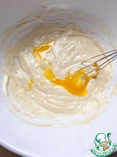 Влить молоко с маслом в муку и хорошо размешать чтобы не было комочков. По одному добавить желтки, размешивая тесто после каждого желтка.