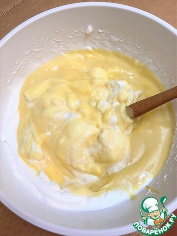 Лопаточкой, движениями снизу вверх, аккуратно вмешать желтки в белки.