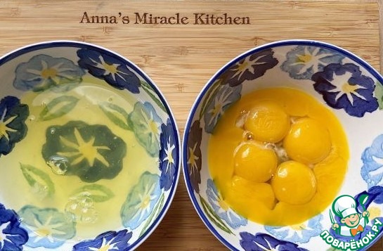 Яйца разделить на белки и желтки.