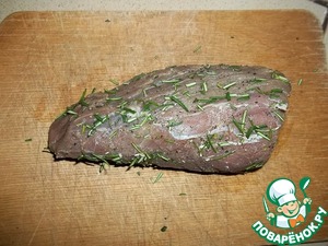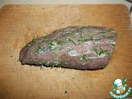 Для этого рецепта подойдет только свежая говяжья вырезка, выбирайте не слишком толстый кусок. Мясо промыть и обсушить. Натереть солью и смесью специй (черный и белый перец, кориандр), Оставить на 30 мин. Порубить розмарин, обвалять в нем мясо.