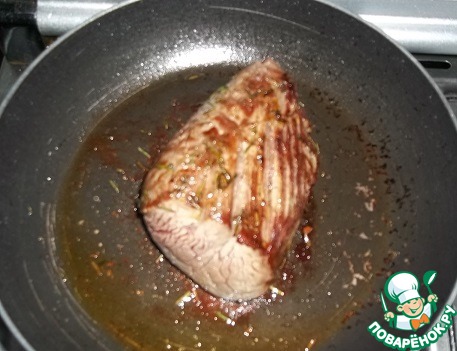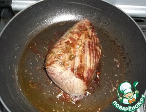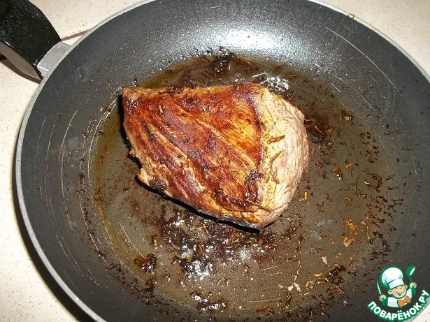 В сковороде разогреть немного оливкового масла, выложить кусок мяса,