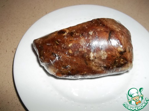 Выложить мясо на пищевую пленку, натереть пропущенным через пресс чесноком и плотно завернуть. Дать остыть около часа, затем убрать в холодильник на 5-6 часов или на ночь.