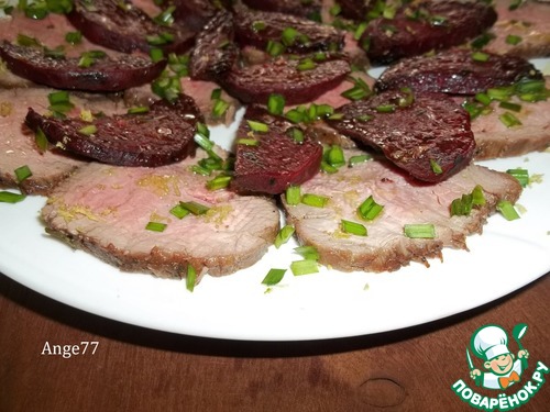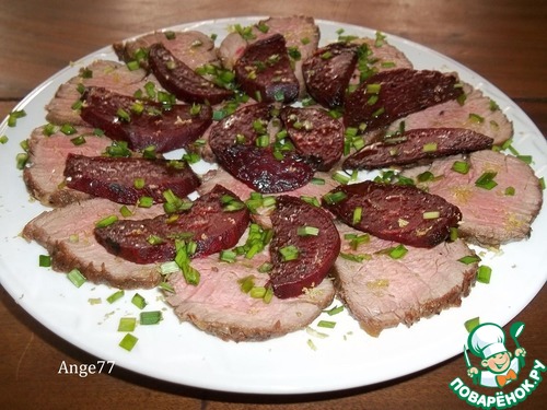 Для подачи мясо нарезать тонкими ломтиками. Мясо хорошо нарезается, слегка розовое внутри, но не сырое, сочное. Выложить на тарелку с ломтиками свеклы, посыпать мелко рубленной свежей зеленью, полить заправкой