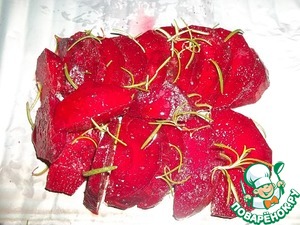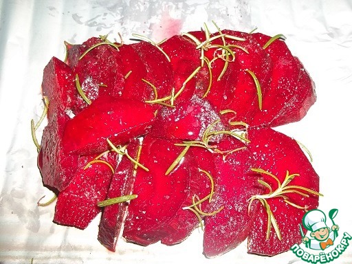 Для свеклы тщательно смешать вилкой 2 ст. л. лимонного сока, уксус (1 ст. л.) и сахар (1 ч. л. без горки). Свеклу нарезать ломтиками. Присолить и поперчить, смешать с маринадом. Выложитть на фольгу (я делала двойной слой фольги), полить оливковым маслом, добавить немного розмарина. Завернуть конвертиком, приподнимая бортики к вурху, чтобы маринад не вытек. Запечь в духовке в течении 30 минут.