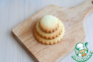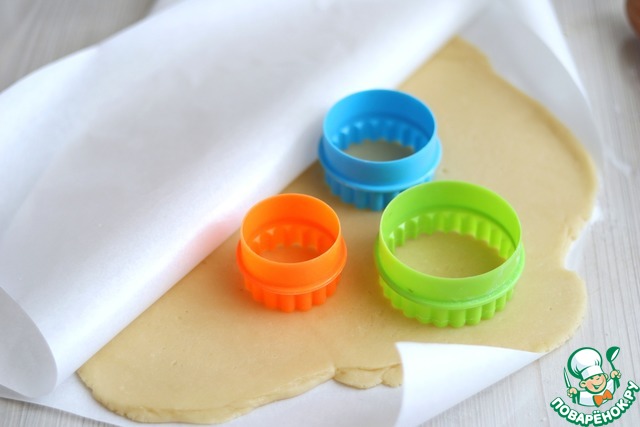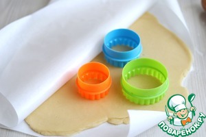 Песочное тесто раскатать между двумя листами пергамента толщиной примерно 3-5 мм. Для приготовления пирожного вам потребуются вырубки для печенья равные по форме, но разные по диаметру. Всего 3 шт.