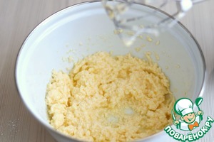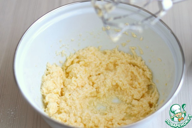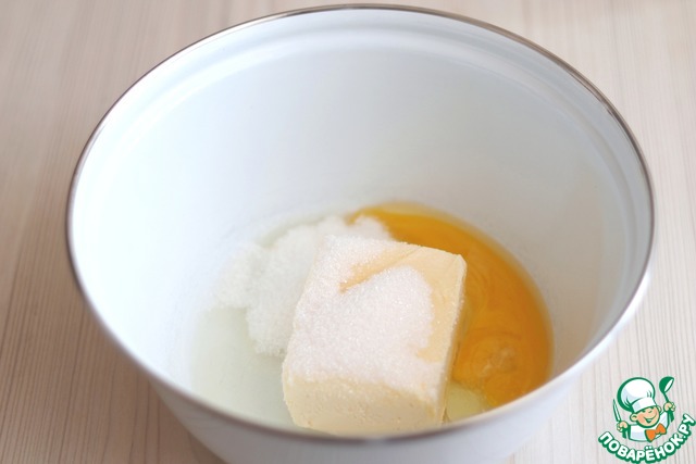 В миску добавить 150 гр. мягкого сливочного масла, добавить 3 ст. ложки сахара, добавить 1 пакет разрыхлителя, соль (1 щеп.), яйцо (1 шт.)