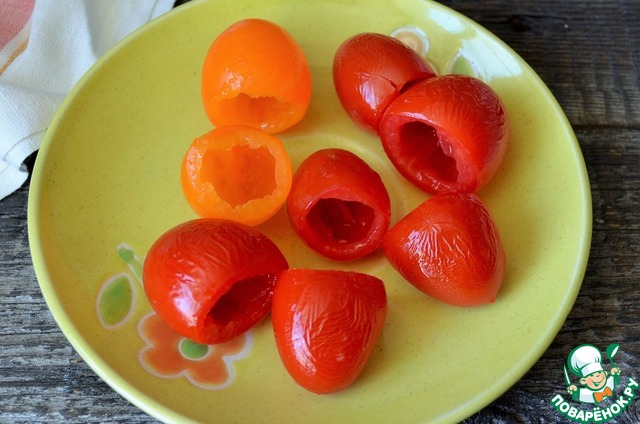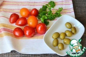 Для подачи разрезать черри пополам. украсить зеленью и колечками маслин.