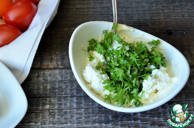 Смешать творог, майонез, рубленый чеснок и зелень.