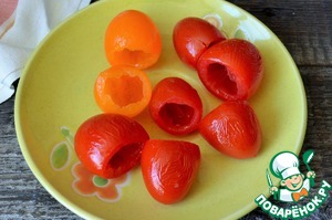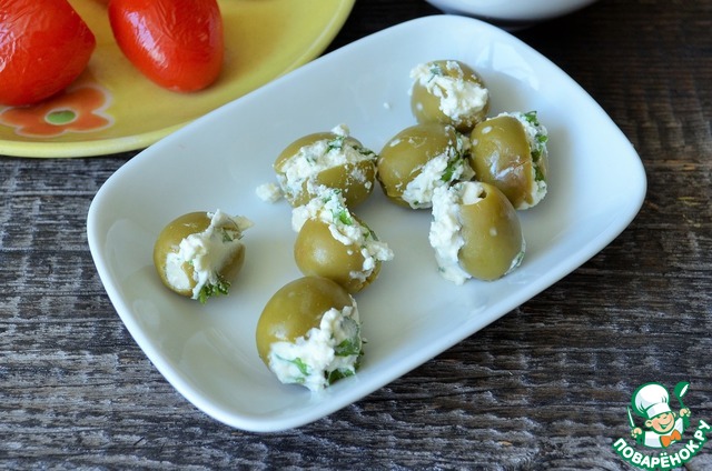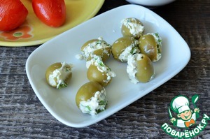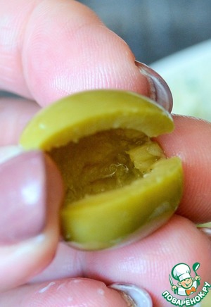 По чуть-чуть массы и маслины вложить в черри, слегка уплотнив.