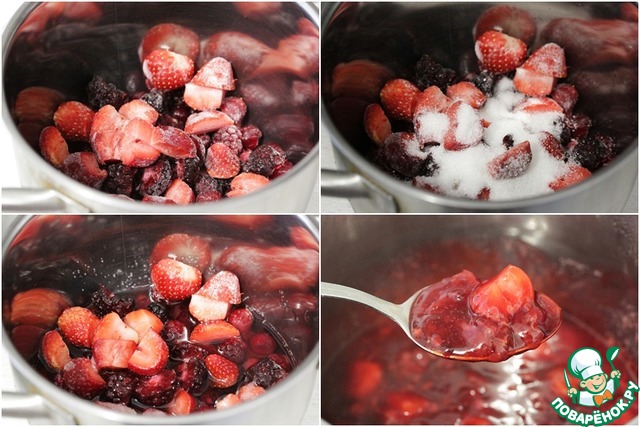 Ягодное ассорти выложить в кастрюлю (размораживать не надо, крупные ягоды можно разрезать на части), всыпать сахар, влить 200 мл воды.