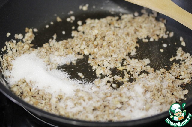 Добавить сахар и, помешивая, обжарить еще немного, после чего снять с огня и пересыпать в миску.