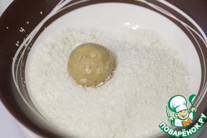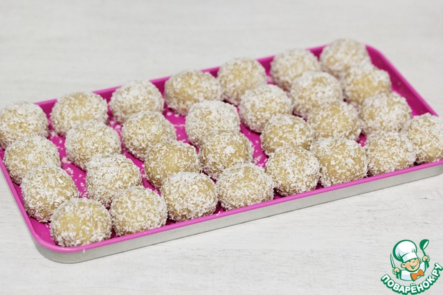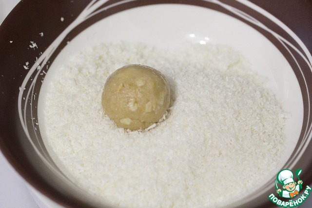 Сформовать круглые конфеты и обвалять их в кокосовой стружке.