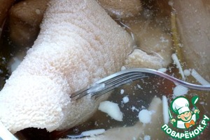 Приготовить заправку из перца, кориандра, уксуса, растительного масла, соли и щепотки сахара. Чеснок нарезать пластинками и добавить в заправку.