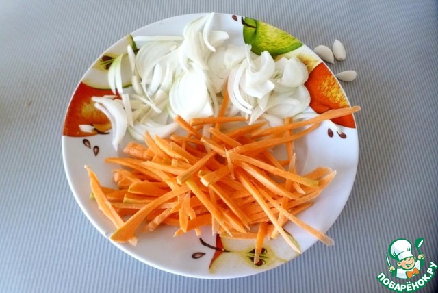 Нарезать лук полукольцами, морковь соломкой.