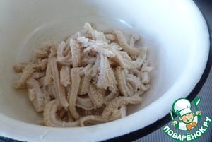 Нарезать вареный рубец соломкой.