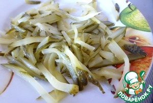 Маринованный огурец нарезать соломкой.