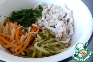 Соединить рубец, маринованный огурец, припущенные лук и морковь в миске. Добавить нарезанную зелень. Полить заправкой.