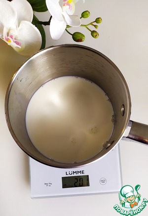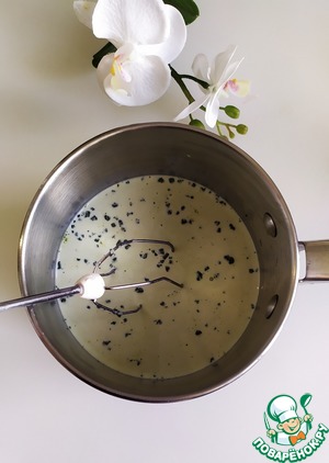Добавить сливки и все хорошо перемешать. Сотейник поставить на огонь, довести смесь до кипения, постоянно помешивая, но не кипятить. Снять с огня, добавить желатин, мешать до полного его растворения.