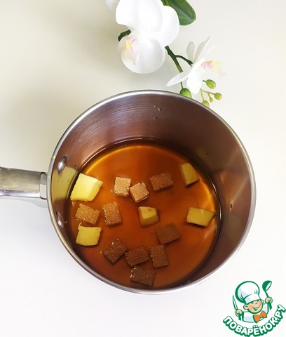 В сотейнике соединить порезанный имбирь, сахар и влить 250 мл. воды. Довести до кипения.