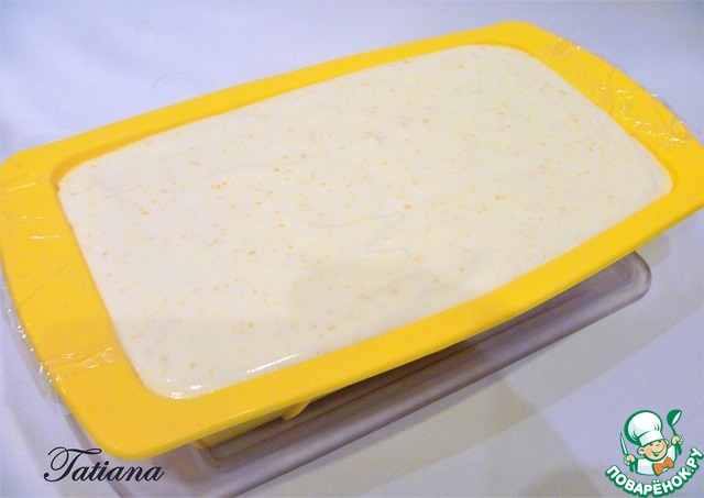 Желатин 3 ч. л. (15 г.)замочите в холодном молоке, набухший желатин распустите ( в микро 60%=1,5 мин.)Распущенный желатин влейте в творог, перемешайте.