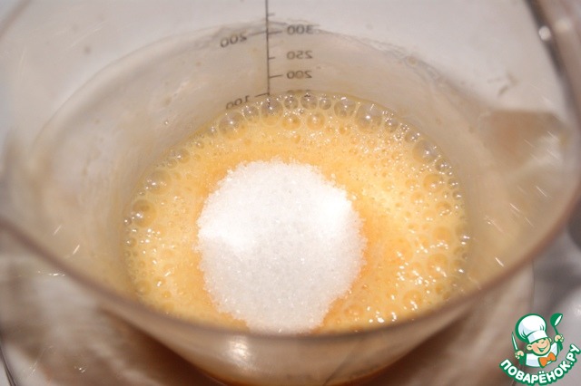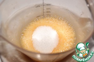Яйцо и белок слегка взбить венчиком и добавить сахар, опять слегка взбить. -