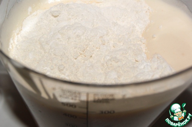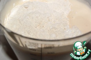 Всыпать муку и очень хорошо перемешать. На фото видно, что мука держится на поверхности. значит яйца взбиты правильно.