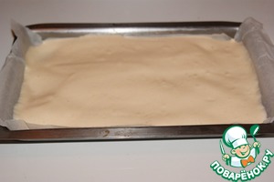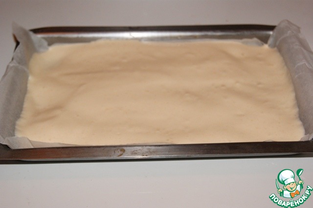 Распределить тесто на противень размером 15х22 см застеленный пекарской бумагой и выпекать в прогретой до 170"С духовке 8-10 минут.