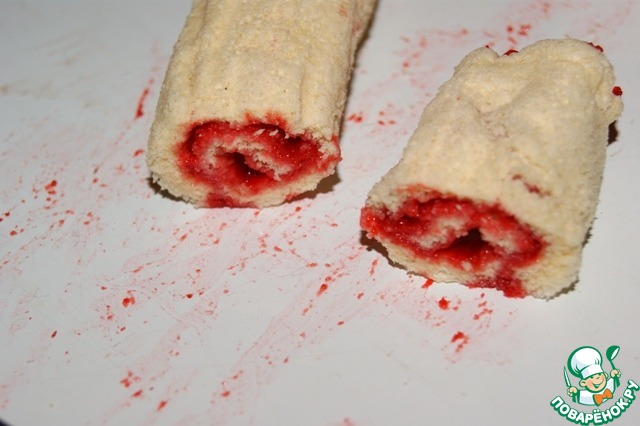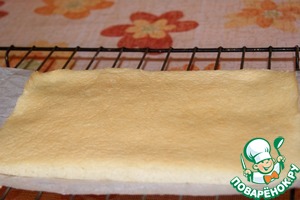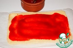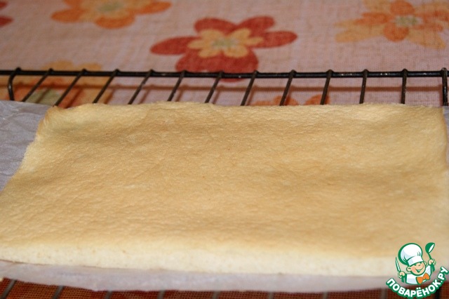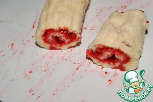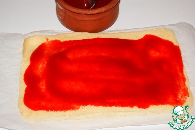 Освободить от бумаги и намазать тонким слоем джема. У меня протертое клубничное пюре 50 г, которое я загустила 6 г желфикса, добавив его в пюре и проварив после закипания 2 минуты.