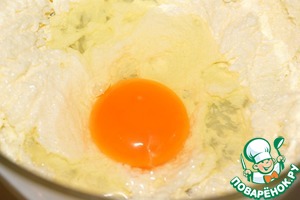 Мягкое масло взбить с сахаром до состояния крема, не переставая взбивать ввести по одному яйца. -