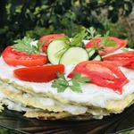 7. Остывшие коржи промазываем творожной начинкой. Сверху торт украшаем кружочками помидора и листиками кинзы.