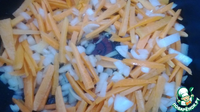 К луку с морковью добавить рис и томить на слабом огне в течении 5- 8 мин.