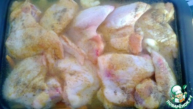 Сверху уложить крылышки, посолить и поперчить сверху.