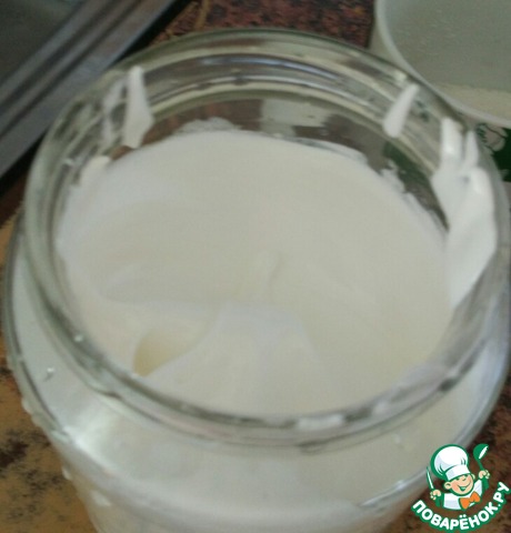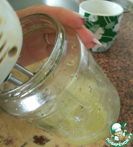 Сначала поставьте духовку разогреваться духовку на 120 градусов. Для удобства при взбивании возьмите литровую банку, в нее вылейте белок и добавьте щепотку соли.