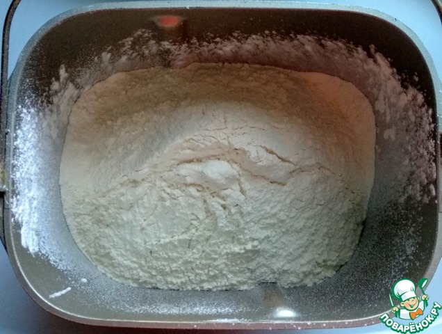 Тесто я буду замешивать в хлебопечке. В ведёрко хлебопечки вылить кефир, добавить соль и соду, просеять муку.