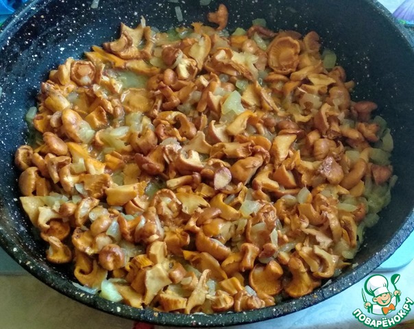 Далее грибы лисички помыть, порезать. Лук почистить, помыть и нарезать кубиками. Обжарить грибы с луком на оливковом масле до готовности, примерно, 10-15 мин.