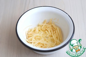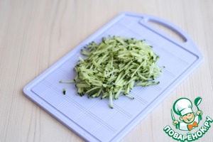 Огурец (1 шт.) нашинковать на терке для приготовления корейских салатов с мелким сечением. Огуречную соломку слегка отжать.