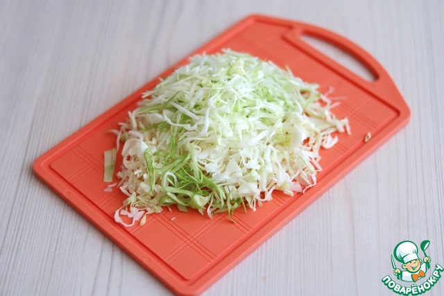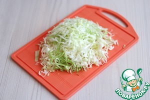 Для приготовления салата нам потребуется ранняя капуста с сочными, нежными листьями. Капуста плотной структуры для приготовления подобных салатов не подходит. Капусту налишковать тонкой соломкой, можно воспользоваться специальными терками для шинковки капусты.