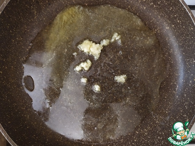 На медленном огне растопим 10 грамм сливочного масла. Выдавим чеснок и обжарим его, около минуты.
