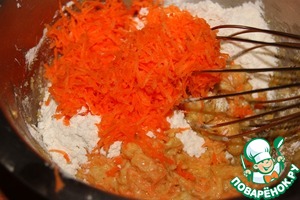 Добавить к масляной смеси половину муки и половину моркови, перемешать. Затем добавить оставшуюся морковь и муку, и замесить тесто, желательно меньше трогать его руками.