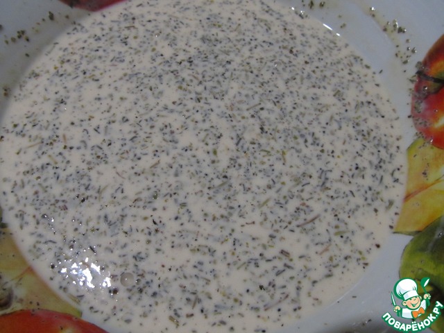 Сливки смешать с яйцами, приправить прованскими травами, солью, перцем и тщательно перемешать. -