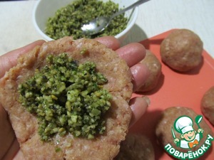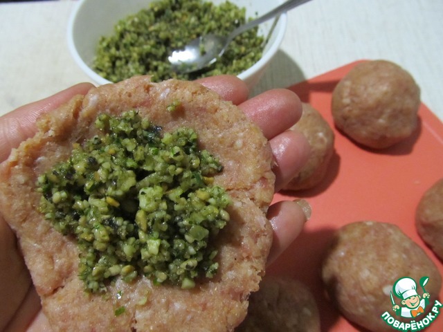 Колобок расплющить в лепешечку и выложить ложку начинку. Сформовать фрикадельки.
