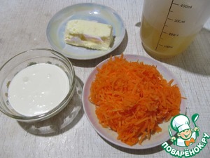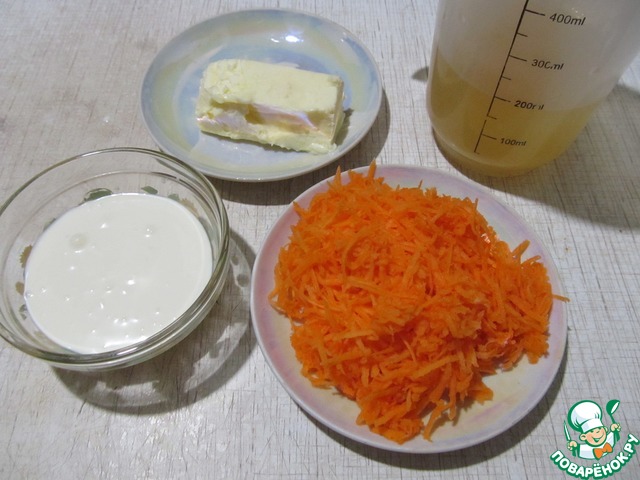 Продукты для морковного пюре: тертая на мелкой терке морковь, сливочное масло, сливки, бульон (у меня куриный, можно и овощной).