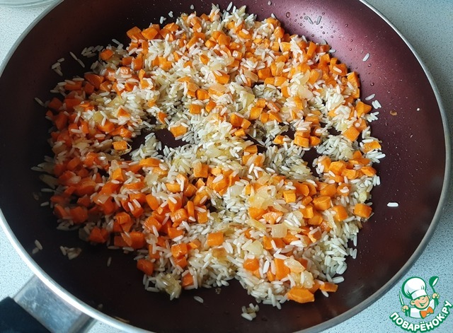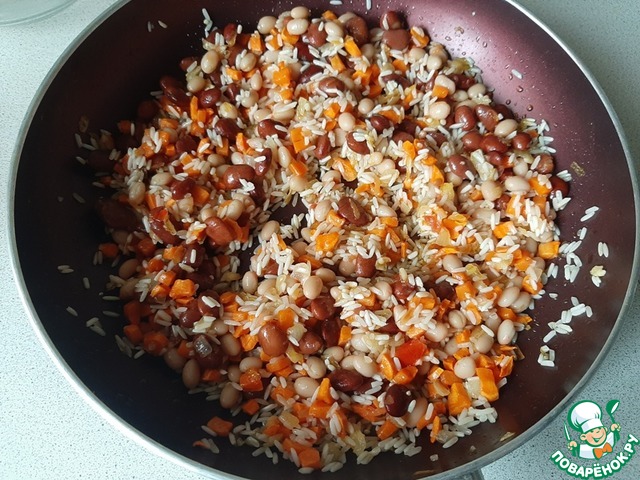 Смешать красную и белую фасоль с рисом и зажаркой, посолить.