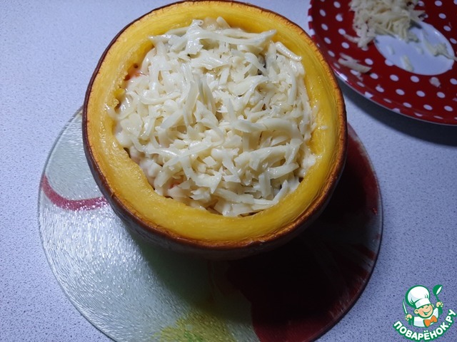За некоторое время до готовности вынуть тыкву и посыпать сыром.
