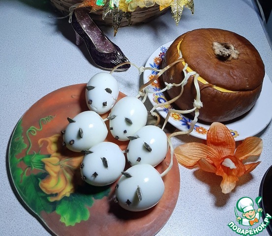 Яйца отварить. Из гвоздики сделать глазки и носик, из семечек - ушки.
