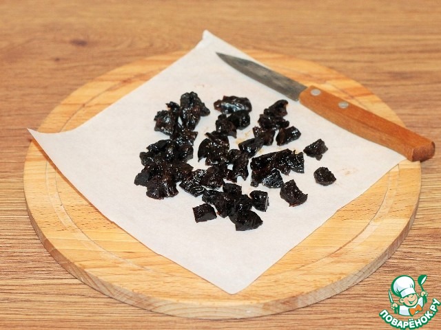 1. Чернослив промыть, обсушить бумажным полотенцем и порубить.