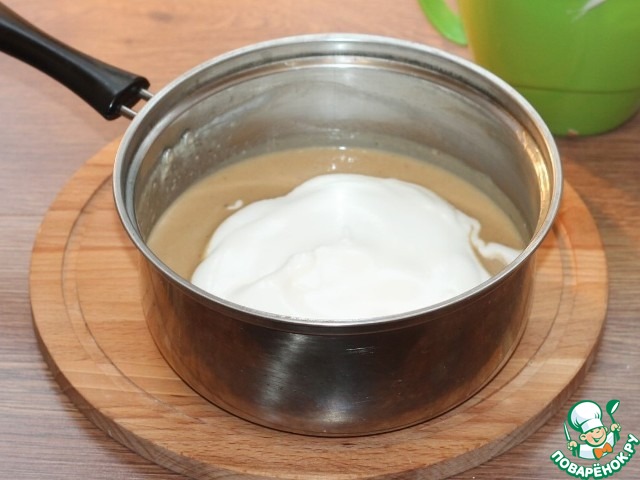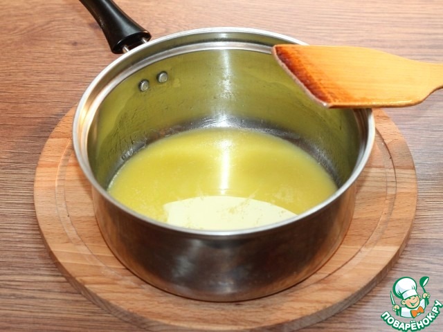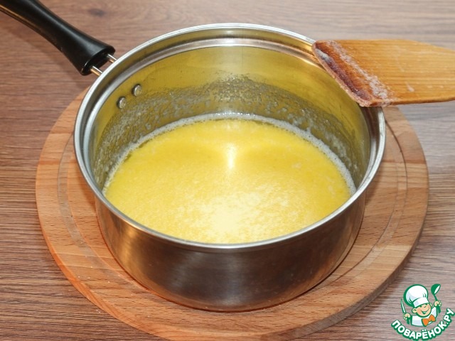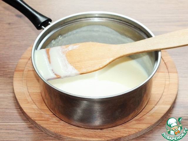 9. Должна получится молочная смесь, по консистенции похожая на жидкую манную кашу. Снимите сотейник с огня, непрерывно помешивая, остудите до 40 С.