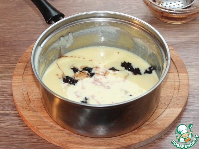 11. Добавьте в сотейник желтки, чернослив и 1 ст. л. вина (от замачивания чернослива), перемешайте венчиком.