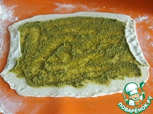 Итак, половину теста раскатать в прямоугольник толщиной 3 мм и выложить половину песто, распределить его по поверхности, оставляя со всех сторон свободные края примерно по 2 см. Боковые стороны загнуть вовнутрь, прижать.