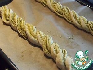 • Каждый рулет разрезать острым ножом пополам по всей длине. Самое начало рулета не прорезать. Потом сделать из двух половиной жгут, стараясь, чтобы песто было сверху. Хорошенько скрепить конец.